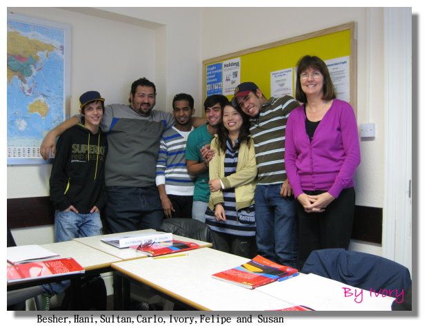 專業.耐心的Susan老師:剛開始上課的前兩週,我的心情真的非常緊張,前面提過我剛到英國的時候,在滑鐵盧火車站詢問關於車票的問題,卻完全聽不懂外國人的回答,也許我的說與聽程度都比不上小學生(嘆氣),事實上,我真的不曉得老師在說什麼,為了讓自己盡快進入狀況,索性選擇坐在最靠近老師的位置,剛開始有遇到不友善的同學,同學轉班之後,情況也漸漸好轉,我也不需要每節下課戰戰競競地複習上一堂課的內容,因為我完全進入狀況,上課氣氛超級歡樂,我的心情也超級開心。