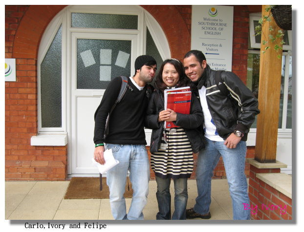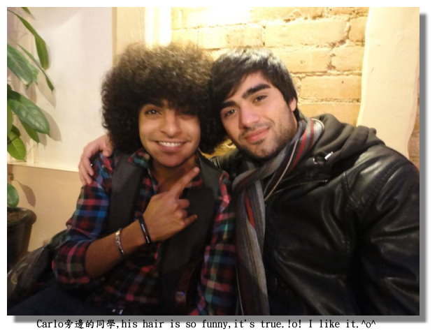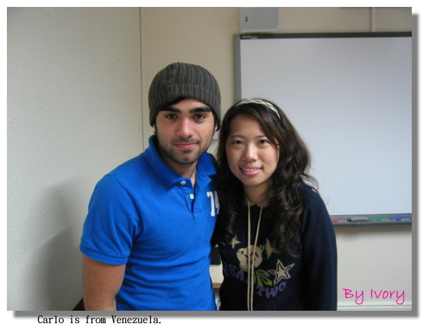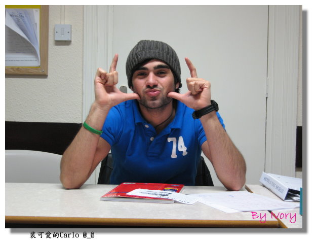 來自委內瑞拉的Carlo 搞笑三人組的成員,義大利混血男孩,剛開始還不覺得他可愛,混熟之後,發現他是個蠻好相處的人,不會因為對話的同學程度不佳就表現出不耐煩,他非常喜歡足球喔!有一次英文對話,我說喜歡足球,他竟然很認真問我:真的嗎?會搞笑說我是他的女朋友的始作俑者就是他,有一次說他喜歡我,我完全沒有嚇到,因為我知道他在搞笑,反而是他緊張的說It's joking,老兄你的膽子也真小,但是後來發現他的膽子越來越大,我索性陪他一起演戲,記得他要離開學校的前一天,我竟然跟他演起TV series的戲碼求他別離去,還要假哭,連老師都開心的笑了,老師說他是個男演員...哈,這麼歡笑的英文課,將會是我永生難忘的回憶。我現在才發現義大利男生真的好帥又可愛