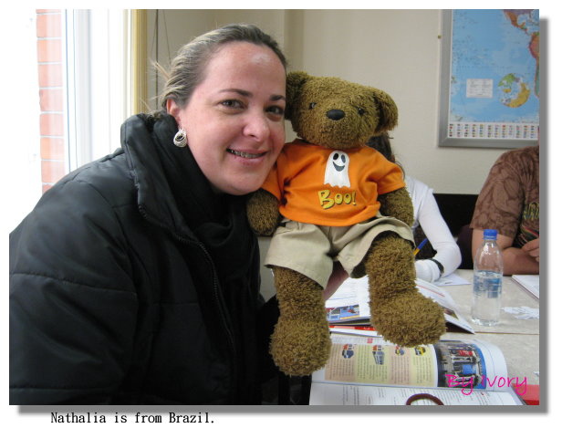 來自巴西的Nathalia 僅就讀兩週,非常友善的同學,她也是惟一一位真的知道台灣的同班同學,可能是之前的某個跨國官司新聞太大,所以她知道台灣在哪裡。見面第二天,她將巴西的洗髮乳與潤髮乳送給我,非常熱情的巴西人,目前已婚。