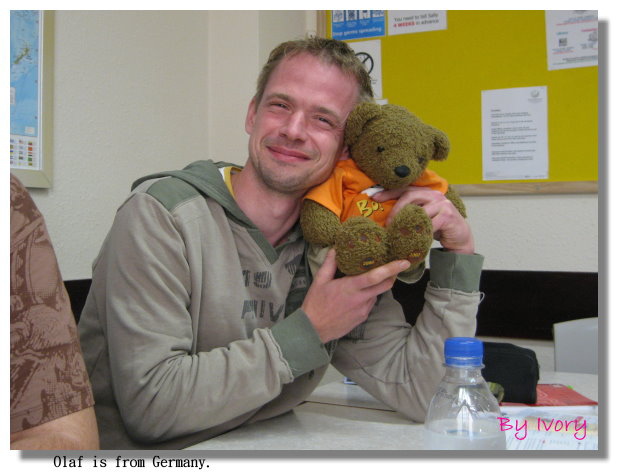 來自德國的Olaf 僅就讀一週,他的發音是同班同學當中最好的一位,我完全聽得懂他在說什麼。歐洲人真奇怪,常常飛來念一週的英文課程就準備回家,這是他的Holiday,他目前就讀大學,已有一個可愛的小朋友了。