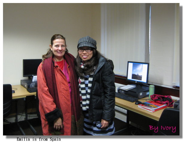 來自西班牙的Emilia 她是一位非常友善的隔壁班同學。第一週在班上遇到兩位不友善的德國女生,心情真的有點不好,在電腦教室遇到Emilia,跟她說我的英文聽力不太好導致在課堂上遇到困難,她很有耐心聽我說並且鼓勵我每天去視聽教室,將會有很大的幫助喔!有她的貼心與關心,漸漸充滿自信。她的孫子剛出生,晉升為奶奶,哈....看不出來吧!她長期住在巴黎會說法文,聽到我要前往巴黎旅行,提醒我小心安全,深深感受到長者的溫暖,謝謝妳。
