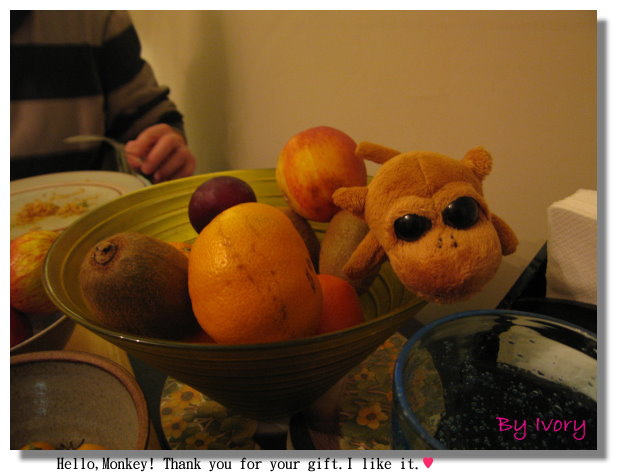 餐桌上出現新成員 某天回家後,發現餐桌上的水果裡有一位新成員喔!大聲說monkey,正在煮飯的爸爸很驚訝我說了這個單字,我說桌上有一隻好可愛的猴子玩具,他也覺得很奇怪家裡為什麼會出現這個東西,原來是別人送給媽媽的禮物,離開前,他們將小猴子放在我的房間送給我,謝謝你們。